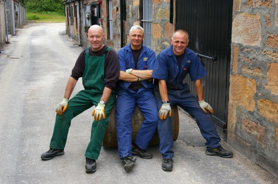 Jag har kameran i en rem över axeln. Men mot slutet av rundturen blir jag mätt på ytterligare tillskott till min växande bildsamling av pagodtak, polerade kopparpannor, traditionella jäskar av douglasgran och fat staplade i välfyllda lagerhus, alltsammans fotat i möjliga och omöjliga vinklar. Så jag frågar artigt några destilleriarbetare som står och pratar utanför ett av de gamla lagerhusen om de vill vara med på en bild, väl medveten om att främmande människor som springer runt på deras arbetsplats med kameror rimligen har upptagit mer än lovligt mycket av arbetstiden den här sommaren. (Långt senare vill jag också minnas att åtminstone en av herrarna på bilden figurerar som statist i filmen.)
