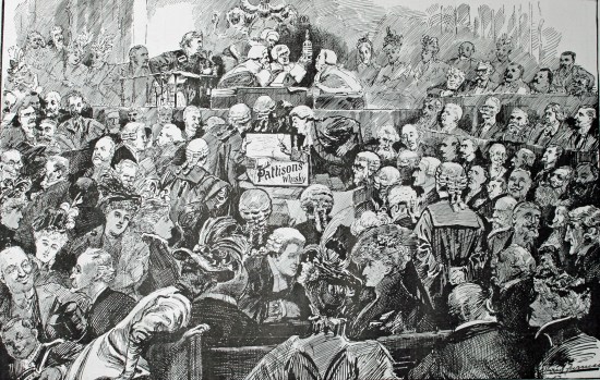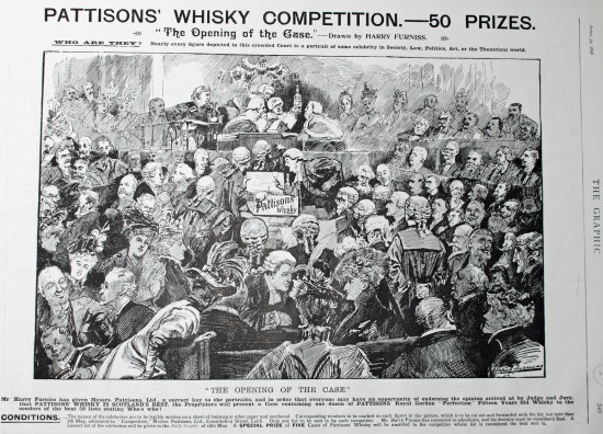 Helsidesannonsen i tidningen The Graphic är från den 30 april 1898. Bilden visar en rättssal. Tre eller fyra domare granskar en flaska whisky och man kan lätt föreställa sig sorlet i trängseln av åhörare. Vilka är människorna på bilden? Tecknarens avsikt har varit att avbilda kända ansikten från bland annat societetens, politikens och konstens kretsar. I tecknarens värld är det en sak som dessa människor har gemensamt. Intresset för Pattisons whisky.