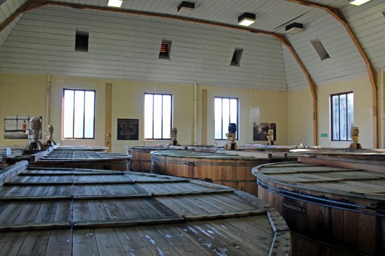 De nio jäskaren av trä inryms i vad som liknar en gammal badinrättning, eller en småstadens samlingslokal från vårt förra sekel. Jag får bilder i huvudet av åtsittande badmössor och tysta simtag i uppvärmt bassängvatten, eller uppklädda ungdomar som trängs läggs väggarna runt ett tomt parkettgolv när musiken börjar spela. Men det enda som frodas här i ungefär 59 timmar åt gången är en jästsvamp som kalasar på en sockerrik vört och pruttar alkohol och koldioxid (i och för sig inte särskilt olikt en sedvanlig tillställning i Folkets hus). Mäsken pumpas sedan vidare för att dubbeldestilleras i något av Tamdhus tre par av pannor. För 2017 planerar Tamdhu en produktion på ungefär samma nivå som förra året (ca 2,9 miljoner liter alkohol). Ytterligare ett lagerhus kommer att byggas under 2017 och man hoppas också på att snart börja bygga ett eget tunnbinderi på destilleriområdet. Men det stora mälteriet som restes 1951 – och som fram till 2010 försörjde såväl Tamdhu som flera andra destillerier – kommer aldrig mer att tas i bruk. Och när en flock av skogsduvor plötsligt lyfter från taket på den höga byggnaden tänker jag att jag måste fråga om det spökar någonstans på destilleriet, men jag kommer givetvis av mig när min sympatiske värd för in samtalet på framtida buteljeringar av singelmalten.